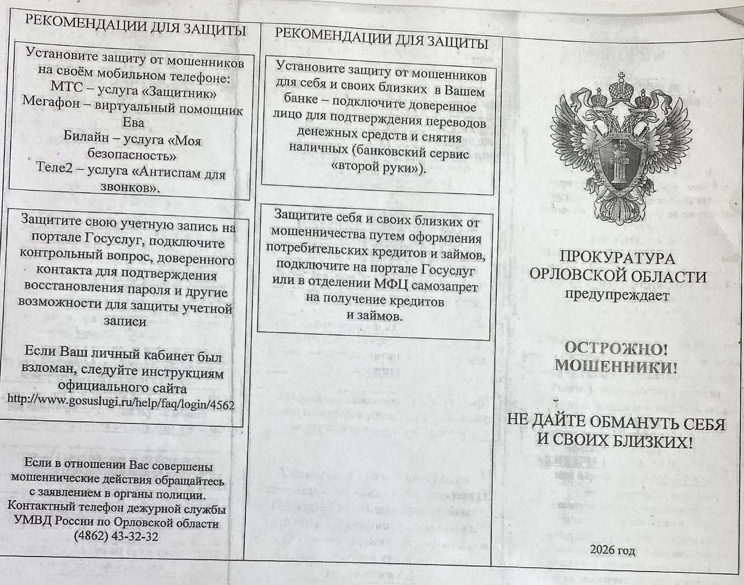 ОСТОРОЖНО! МОШЕННИКИ! Не дайте обмануть себя и своих близких! (Прокуратура Орловской области предупреждает)